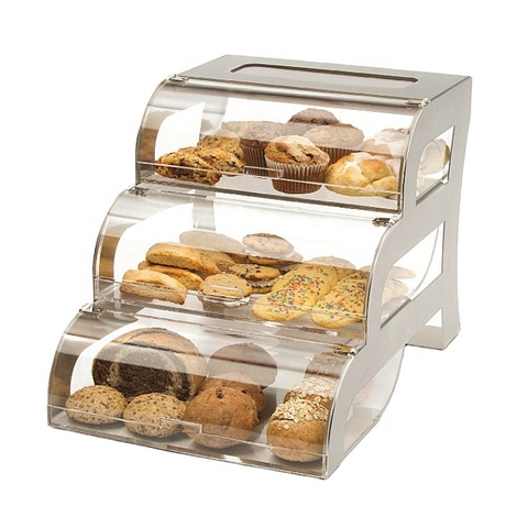 Vitrina de postres de panadería acrílica de varios niveles más vendida, vitrina de pastel de pan de acrílico transparente con puerta de enganche magnético